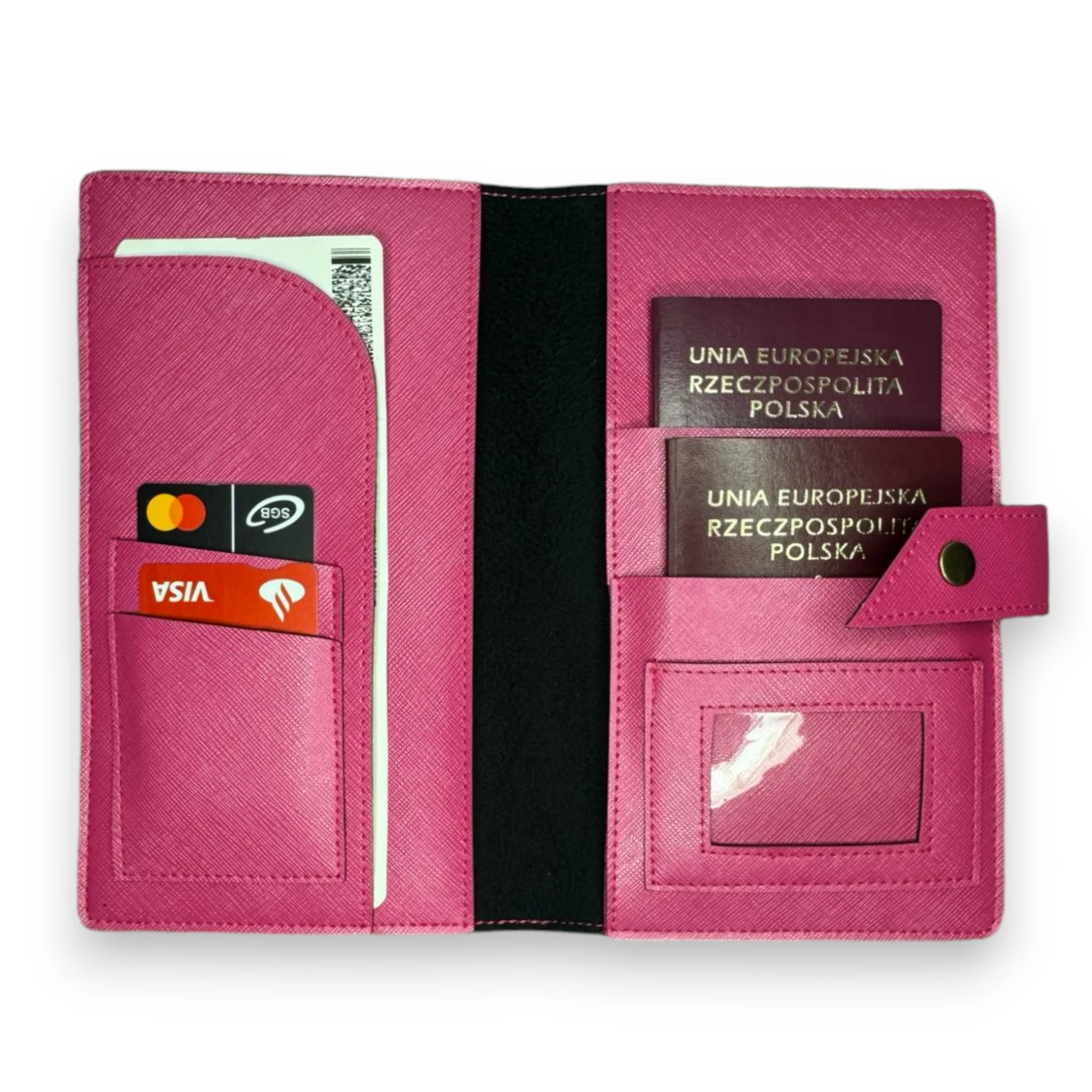 Nasze różowe etui na paszport dla pary to nie tylko elegancki dodatek, ale również doskonałe miejsce na personalizację. Specjalnie zaprojektowane z myślą o parach, nasze etui pomieści dwa paszporty, posiada miejsce na dwie karty płatnicze i bilety lotnicze. W środku znajdują się również dwie duże kieszenie na inne dokumenty. Ciesz się uporządkowaniem i łatwym dostępem do wszystkich niezbędnych dokumentów na lotnisku.