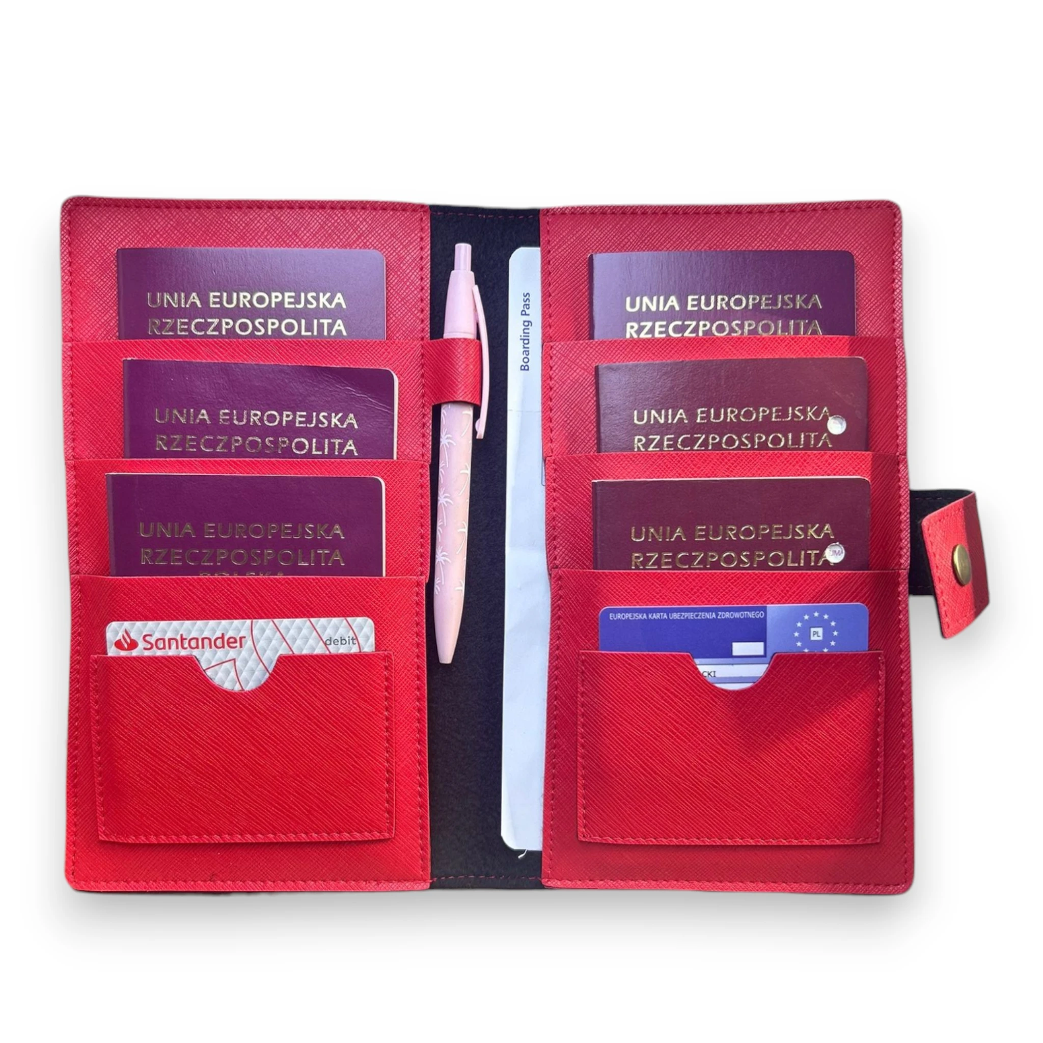 Odkryj nasze wyjątkowe personalizowane etui na paszport w kolorze czerwonym, zaprojektowane specjalnie z myślą o dużych rodzinach i osobach, które często podróżują za granicę. Etui pomieści aż 6 paszportów, co sprawia, że jest idealne dla dużych rodzin. Specjalnie zaprojektowane miejsca na karty płatnicze, dowód osobisty oraz inne ważne dokumenty, zapewniają maksymalną organizację. Dodatkowo posiada miejsce na bilety lotnicze oraz inne niezbędne dokumenty podróżne. Wbudowany uchwyt na długopis pozwala zawsze mieć pod ręką coś do pisania.