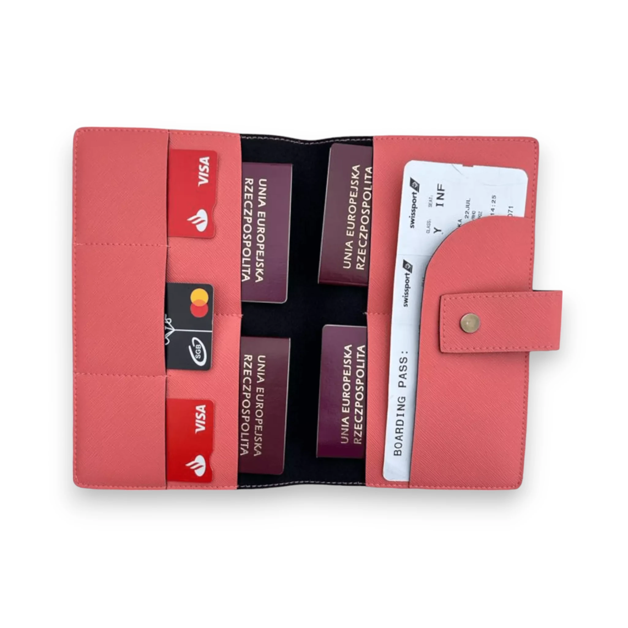 Nasze łososiowe rodzinne etui na paszport to więcej niż elegancki dodatek, to przemyślane rozwiązanie dla wielodokumentowych rodzin. Każde etui jest wykonane z najwyższej jakości materiałów, gwarantując komfort i wygodę podróżowania dla całej rodziny.