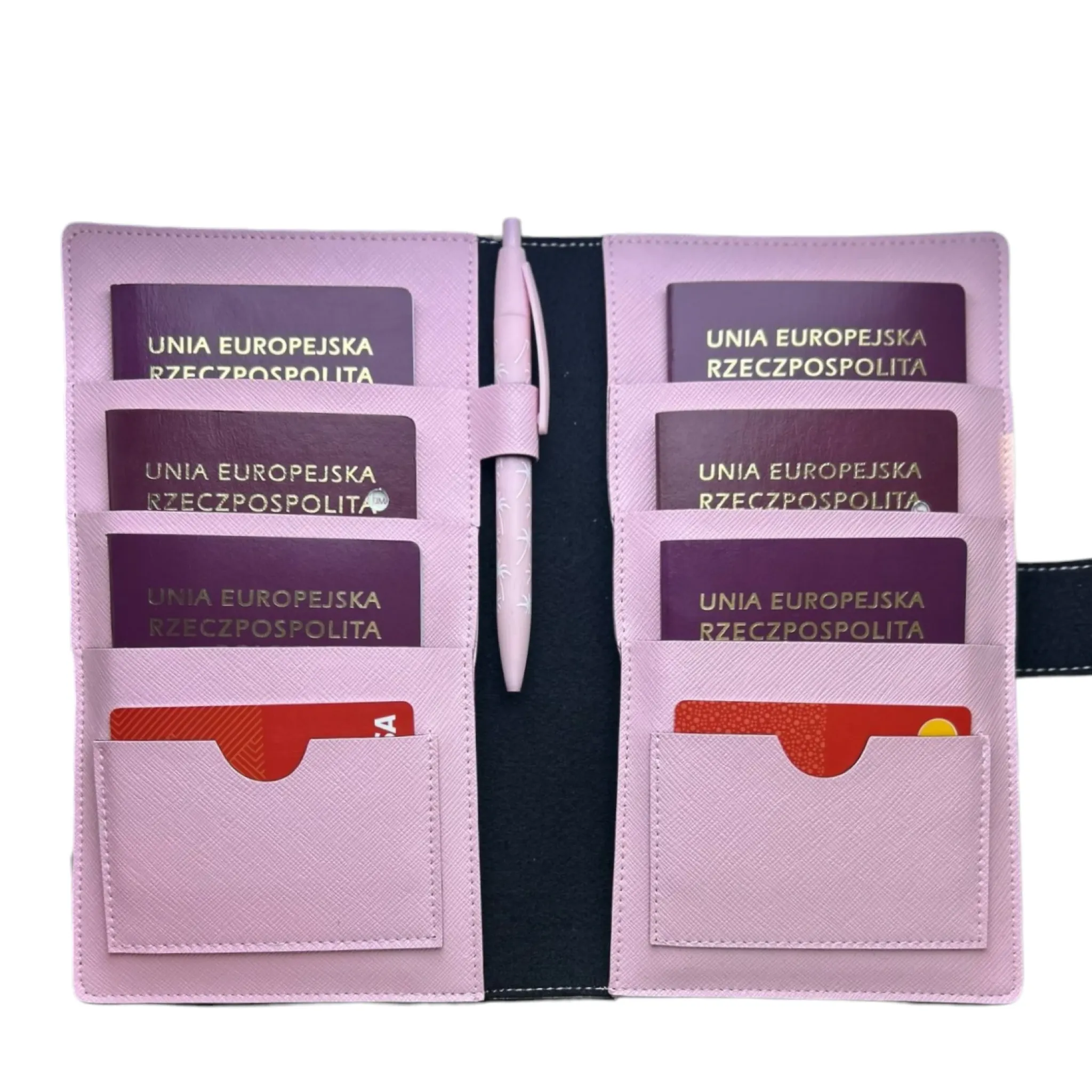 Odkryj nasze wyjątkowe personalizowane etui na paszport w kolorze pudrowego różu, zaprojektowane specjalnie z myślą o dużych rodzinach i osobach, które często podróżują za granicę. Etui pomieści aż 6 paszportów, co sprawia, że jest idealne dla dużych rodzin. Specjalnie zaprojektowane miejsca na karty płatnicze, dowód osobisty oraz inne ważne dokumenty, zapewniają maksymalną organizację. Dodatkowo posiada miejsce na bilety lotnicze oraz inne niezbędne dokumenty podróżne. Wbudowany uchwyt na długopis pozwala zawsze mieć pod ręką coś do pisania.