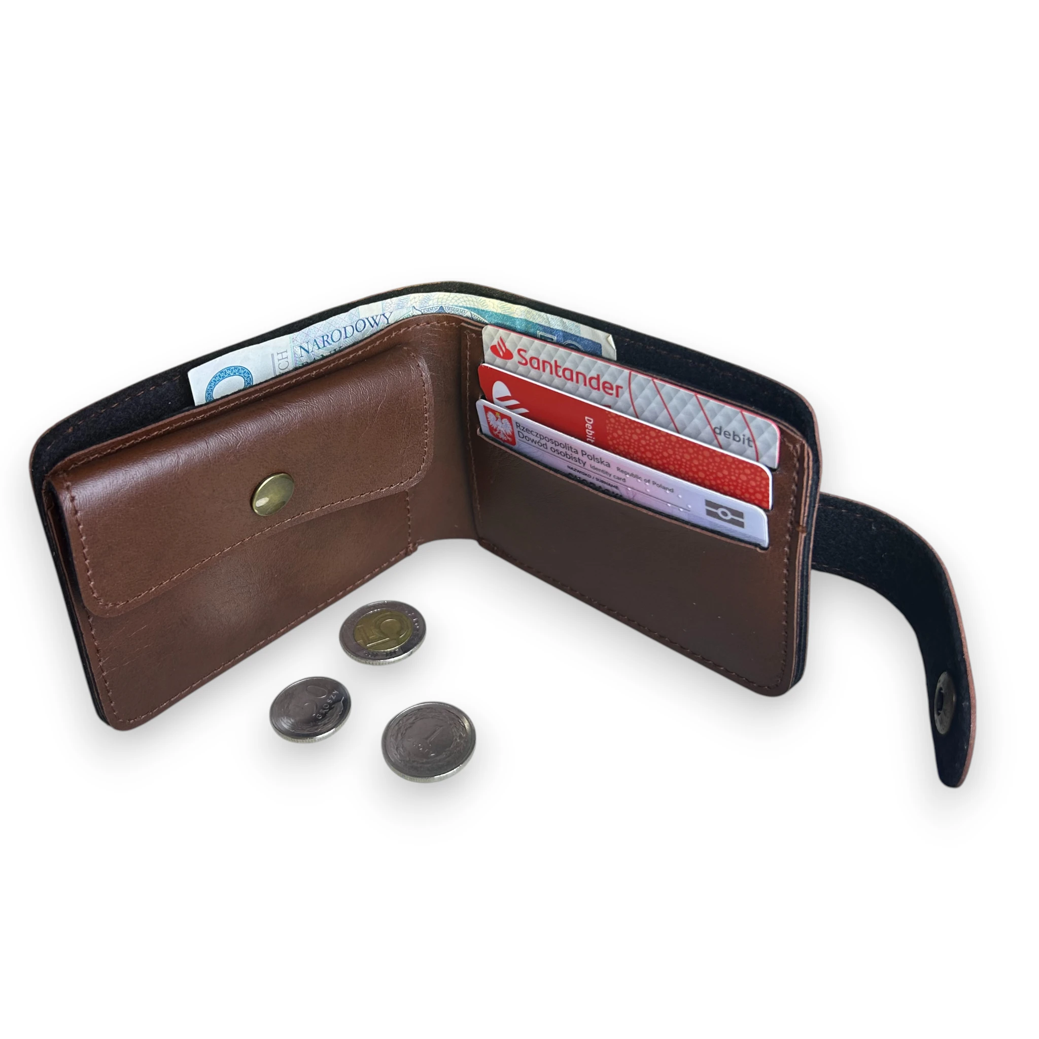 Zamykany na zatrzask – wygodny i bezpieczny, dzięki czemu zawartość portfela pozostaje na swoim miejscu.